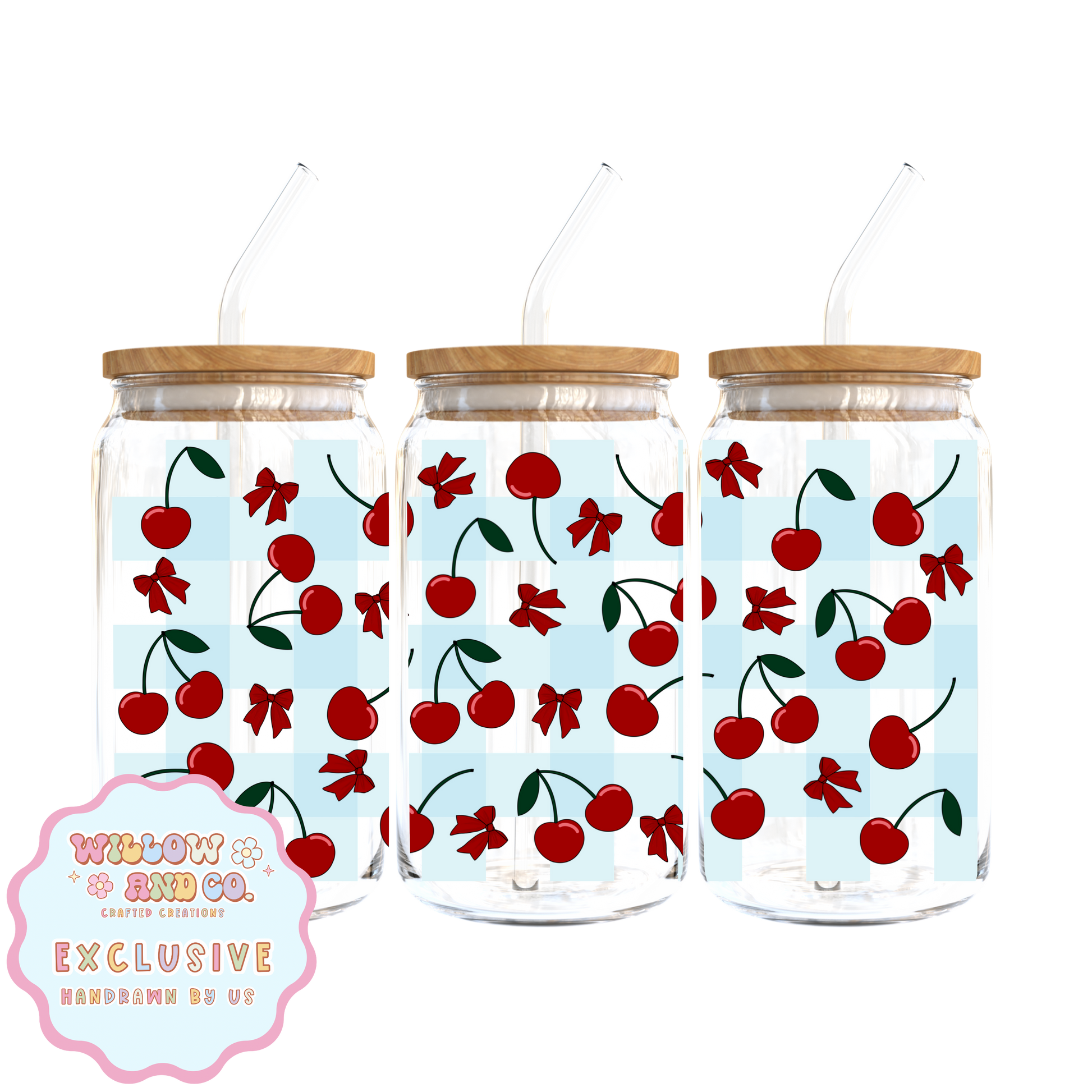 Cherry Vibes (Blue Gingham) - Glass Tumbler