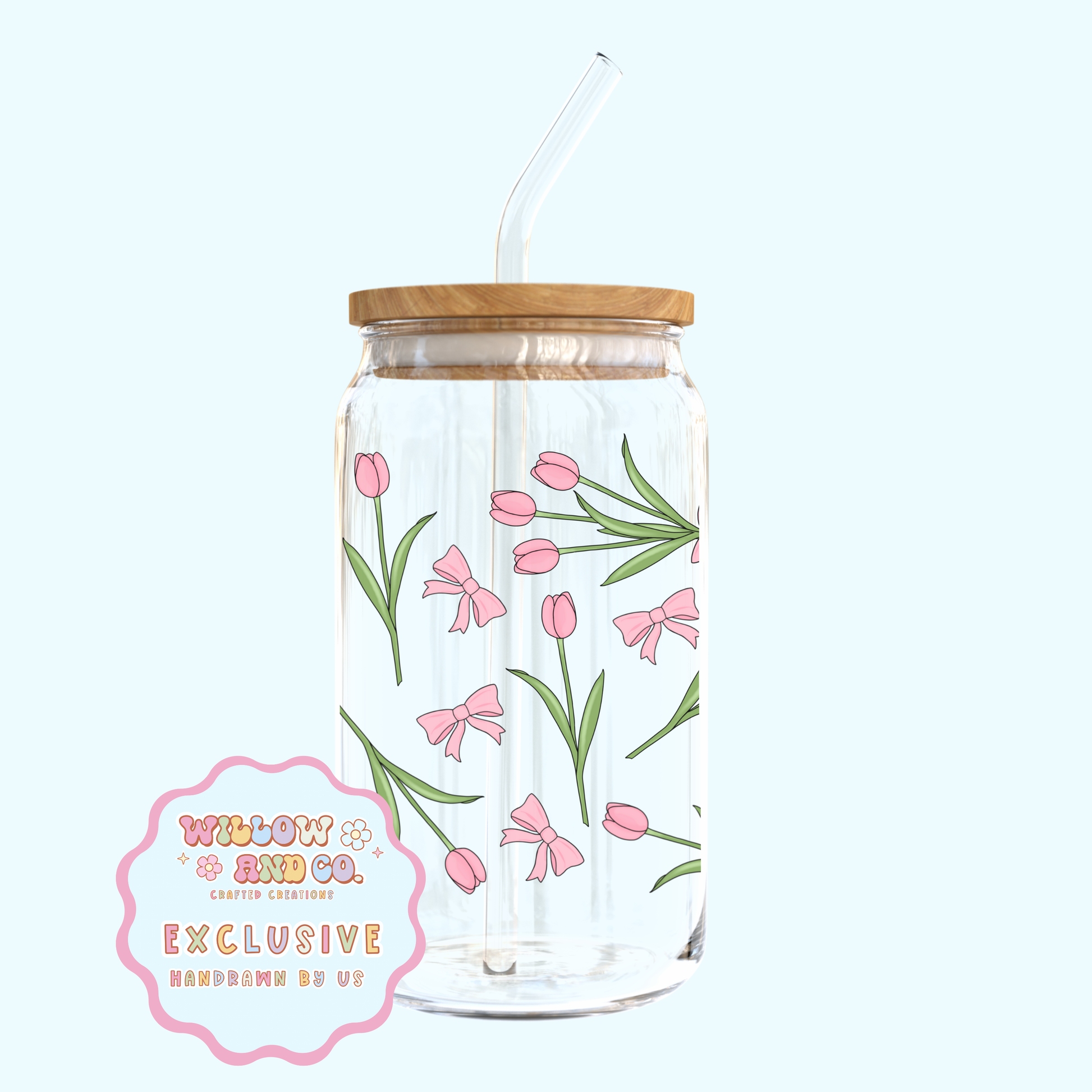Sip your favourite drinks in style with our charming 450ml (16 oz) glass tumblers. Perfect as a gift for loved ones or a treat for yourself, each tumbler comes complete with a bamboo lid and a reusable glass straw, combining elegance with eco-friendly functionality. Our designs are meticulously applied by hand using premium UV-DTF transfers, ensuring they are permanent, waterproof, and able to withstand everyday use and washing.